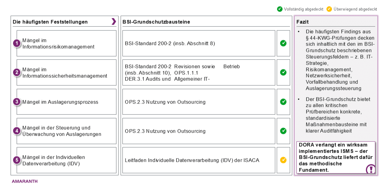 Die vorliegende Gegenüberstellung zeigt: Ein methodisch aufgebautes ISMS nach BSI-Grundschutz adressiert eine Vielzahl typischer Prüfungsfeststellungen, wie sie regelmäßig im Rahmen von § 44 KWG-Sonderprüfungen auftreten.