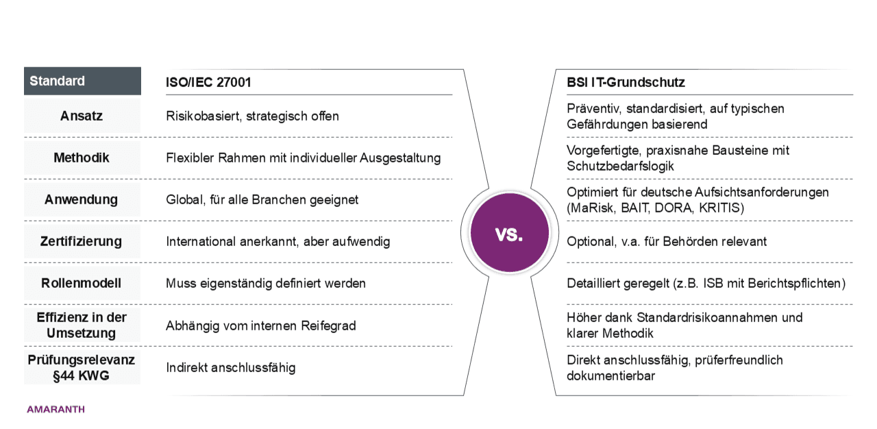Auch für international tätige Finanzkonzerne bietet es sich an, die technischen und organisatorischen Kontrollen für die deutsche Entität am BSI-Grundschutz auszurichten, um der Erwartungshaltung der Aufsicht entgegenzukommen. Dadurch kann auf Konzernebene ein ISMS nach ISO/IEC 27001 implementiert werden, welches in bestimmten Aspekten auf den BSI-Grundschutz zugreift. Das BSI bietet hierfür eine Gegenüberstellung der ISO/IEC 27001 und dem BSI-Grundschutz.