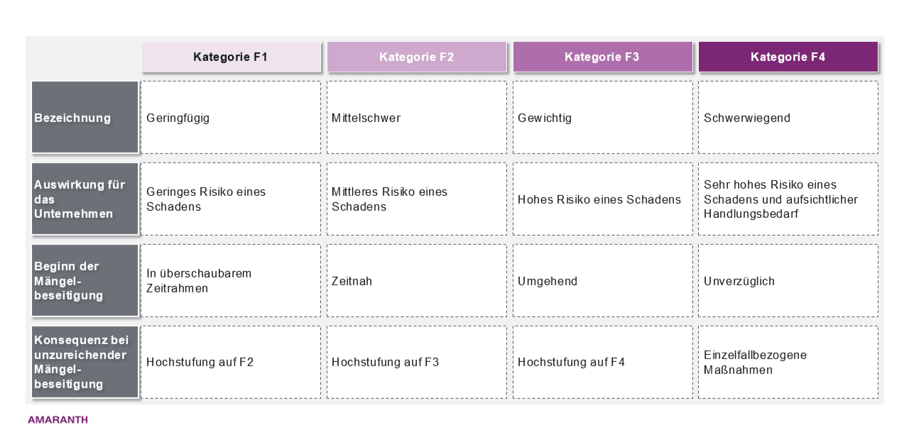 Bei Nichterfüllung der regulatorischen Anforderungen drohen, abhängig vom Schweregrad der Feststellungen, erhebliche Konsequenzen. Die Aufsicht stuft die Schwere von Mängeln typischerweise nach dem F1–F4-Modell ein: von geringfügigen Feststellungen (F1) bis hin zu schwerwiegenden Feststellungen (F4) mit unmittelbarem Handlungsdruck.