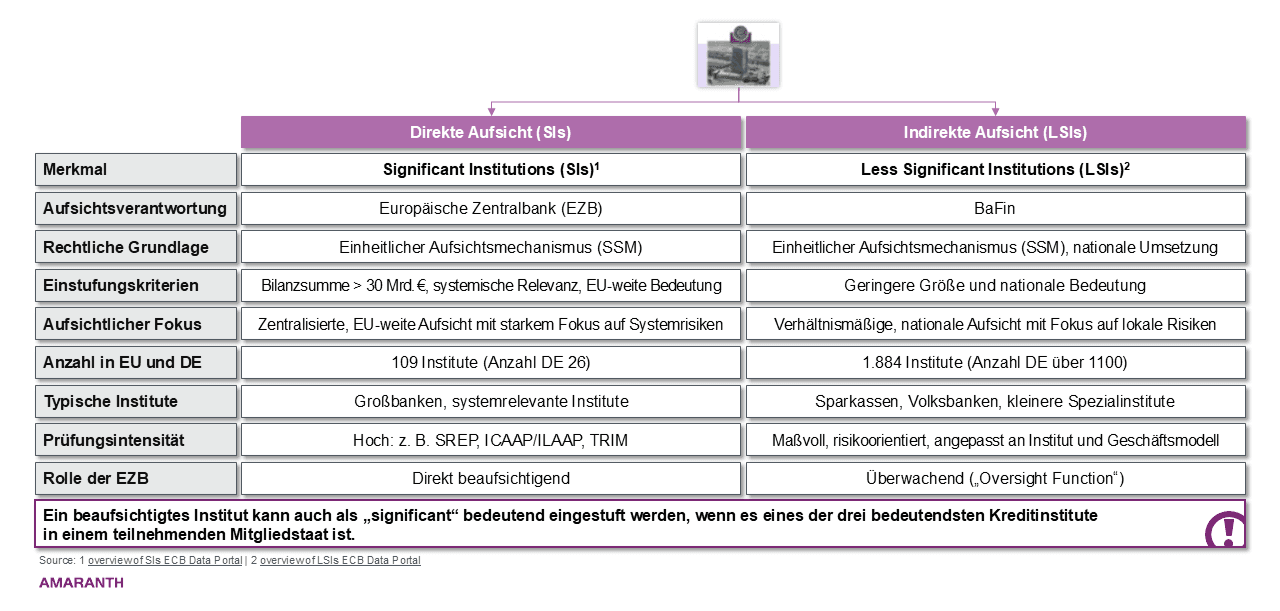 Im Rahmen des SSM wird jedes Kreditinstitut im Euroraum anhand festgelegter Kriterien entweder als bedeutend (Significant Institution, SI) oder als weniger bedeutend (Less Significant Institution, LSI) eingestuft. Die Übersicht zeigt zentrale Unterscheidungsmerkmale: