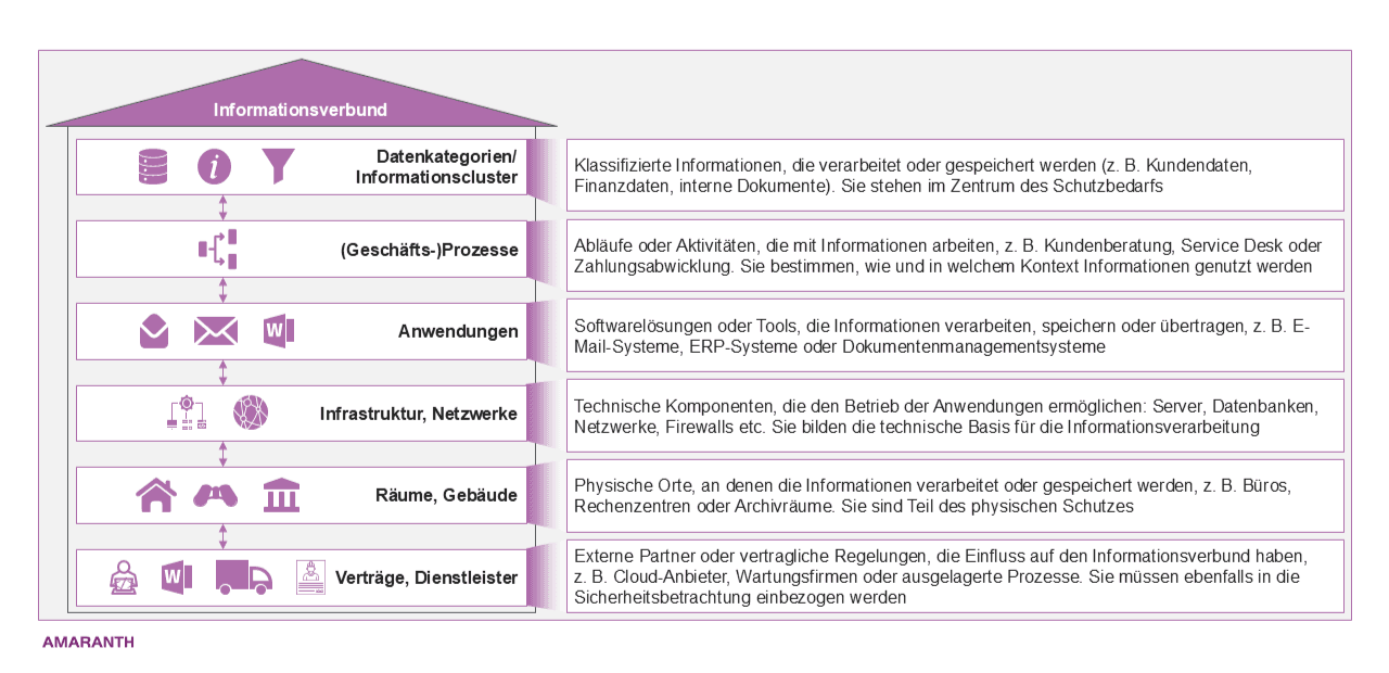 Auch in Bezug auf den Detaillierungsgrad des Informationsverbunds sollte darauf geachtet werden, dass die Komponenten in Schichten aufgeteilt werden, die logisch miteinander verknüpft werden können, um Schnittstellen und Abhängigkeiten darzustellen: